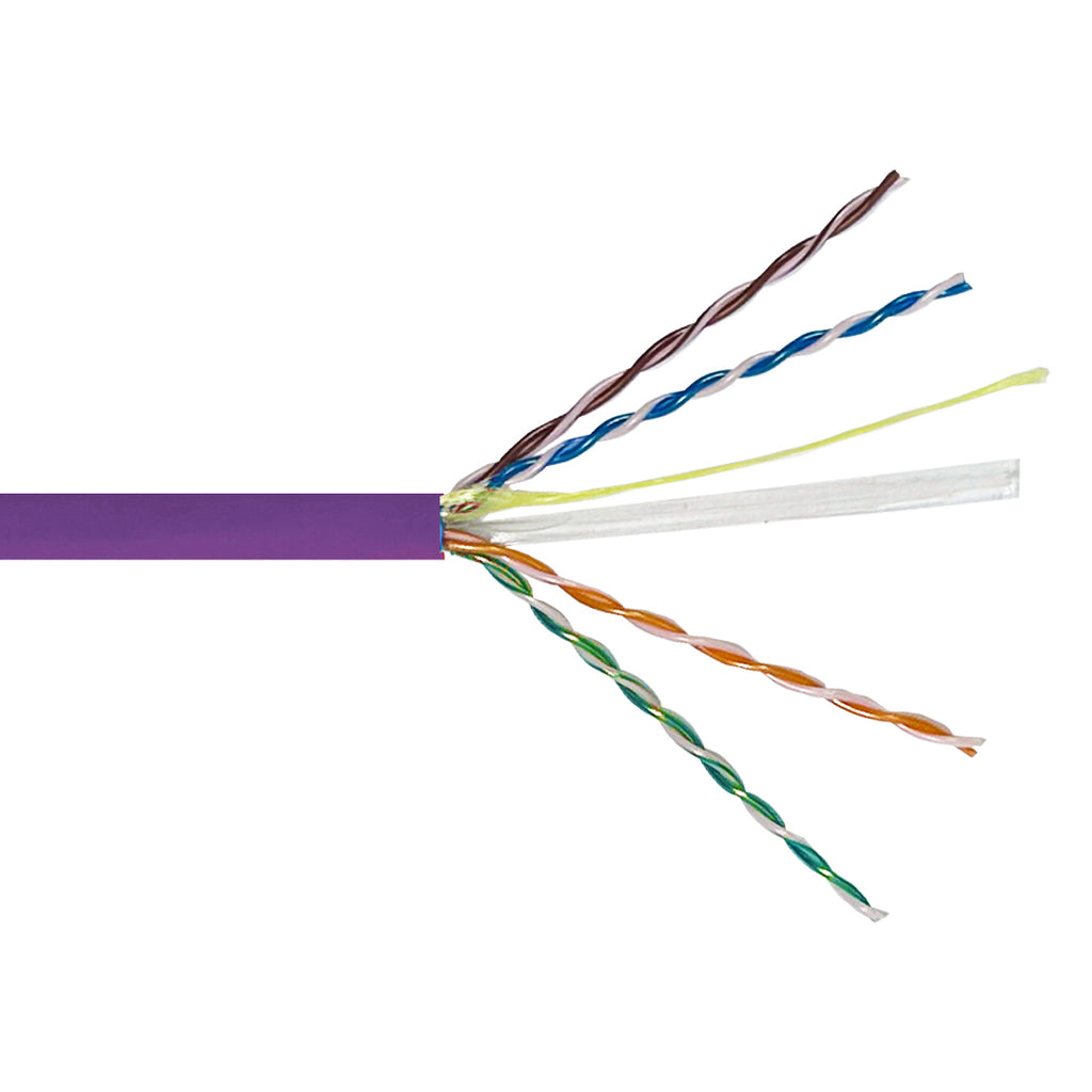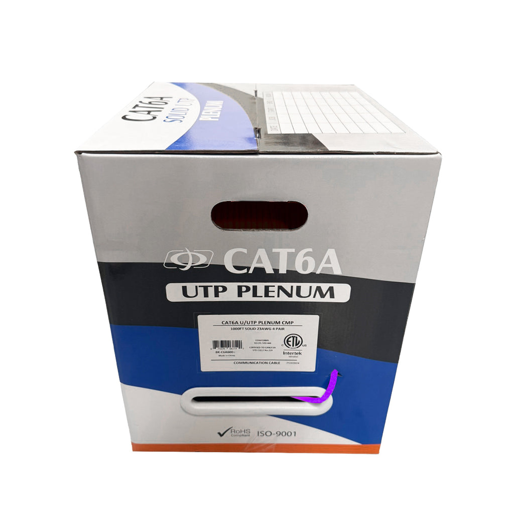 This bulk CAT6A plenum rated cable is 1000 feet in length and consists of 4 pairs of 23AWG solid bare copper wires. It is designed for use in data networking, PoE, security networking and voice applications. The cable is plenum (CMP) UL listed, RoHS Compliant and meets and/or exceeds CAT6A TIA/EIA 568 C.2 standards. It is typically used in plenum environments as premise wiring and terminated from a patch panel to a Cat6A jack.