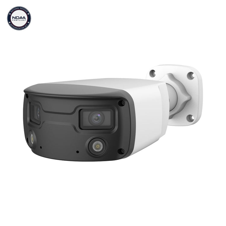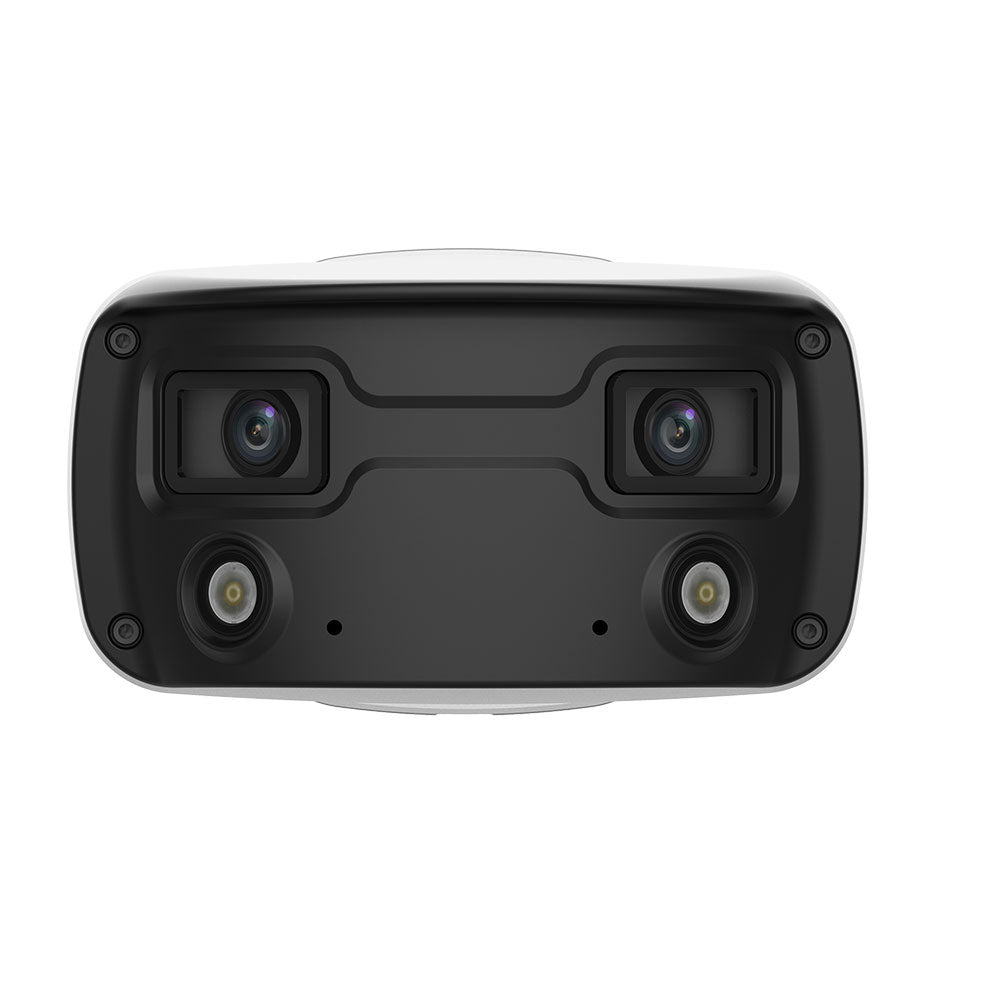 This 8MP wide angle bullet camera provides sharp, high definition images in daylight or nighttime color settings. The camera has two 4.0mm fixed lenses. Its maximum resolution is 5120x1440 at 20 fps and supports Ultra 265 video compression technology, which assures savings in bandwidth and storage. Its double lens splicing technology is adopted to realize the horizontal viewing angle of 180.00°±10° and colorhunter technology ensures 24-hour full-color images . It also features human body detection.