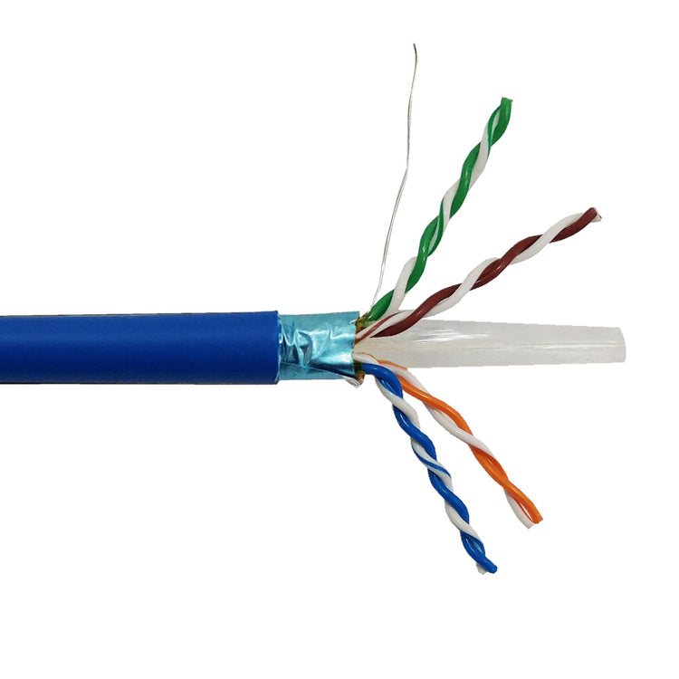 This bulk plenum rated Cat6 cable is 1000 feet in length and consists of 4 pairs of 23AWG solid wires with an overall foil shield. It is typically used in a plenum environment as premise wiring and terminated from a patch panel to a Cat6 jack.